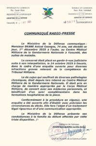 Arrêté le 24 octobre 2025 à Douala, Ekane Anicet avait été placé en garde à vue judiciaire dans le cadre d’une enquête ouverte pour plusieurs infractions qualifiées de « graves » et relevant de la compétence du Tribunal militaire. Le ministère indique que le septuagénaire souffrait de « diverses pathologies chroniques » et qu’il avait été interné dès son interpellation au Centre médical militaire.